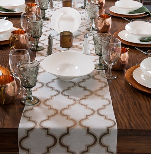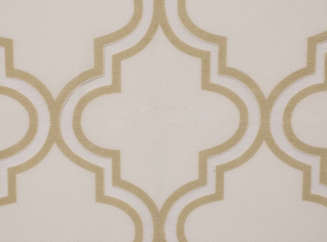 Sahara Sand Moroccan is a tan geometric sheer printed fabric that can take on a different colorway depending on the fabric beneath it.